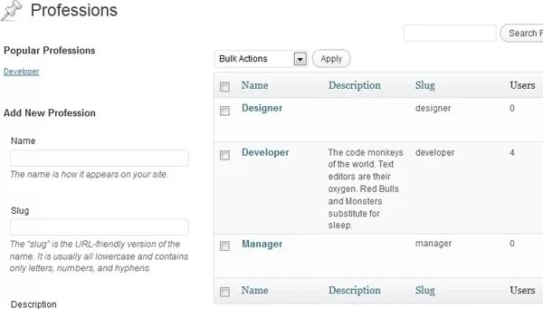 On the back of that Damian Gostomski wrote a plugin and added it too the repository to add said functionality. However the plugin was incomplete and development has stopped. As I am using this sort of functionality in the LocalHero project I have fixed some bugs in the original code and also added some new functionality so that when you use register_taxonomy to register a taxonomy for users you have almost as much control as if he taxonomy was for posts.